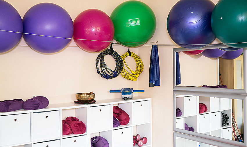 Neben verschiedenen Behandlungsräumen gehört auch ein Gymnastikraum für Kurse und Präventionsangebote zu unserer Praxis.
